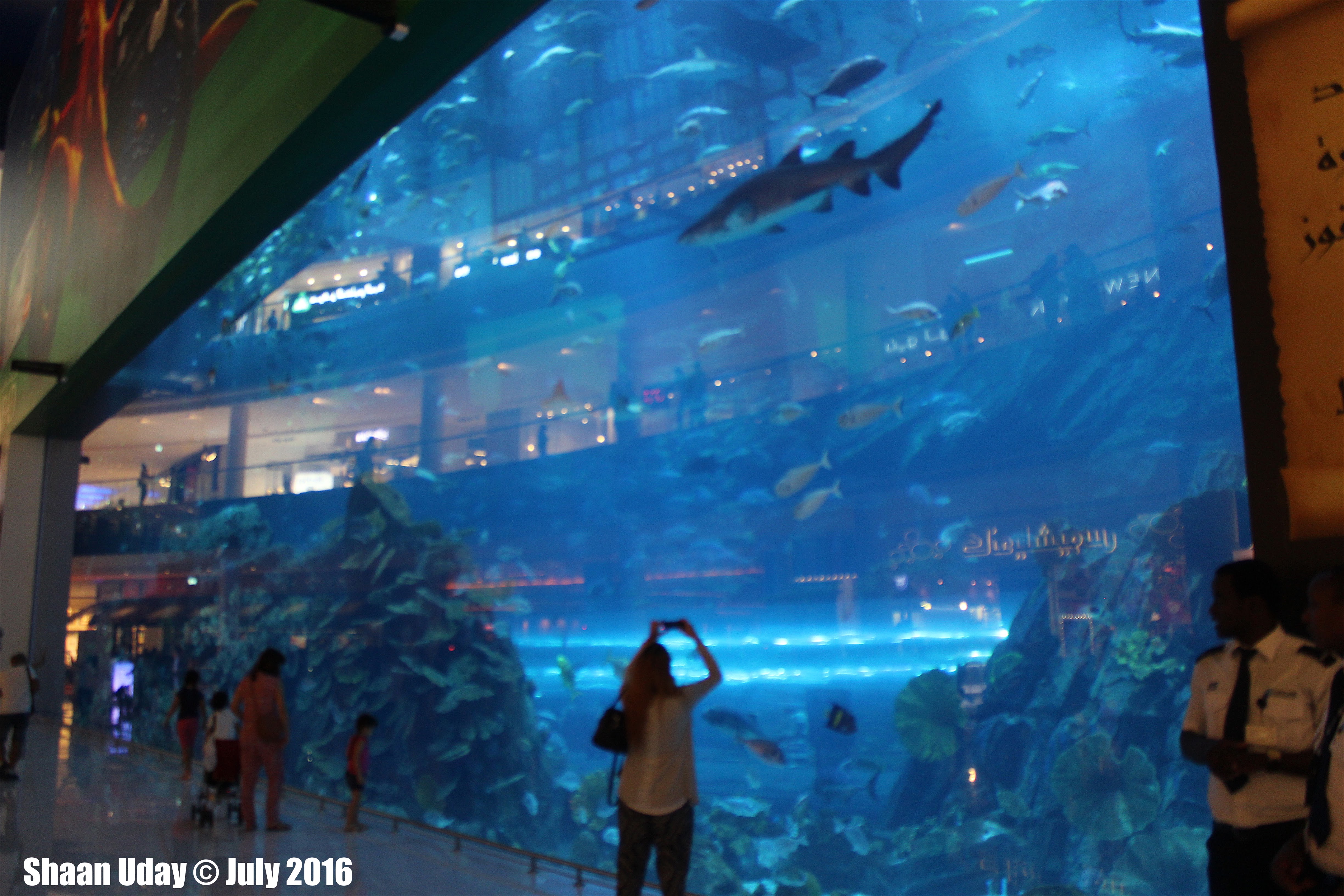 Dinning in Dubai Earlier, we were worried for our brunch and lunch during Ramadan period, but now astonished to experience the availability of food. The food was in abundance even during Ramadan if you are curious enough to look for it as if a mouse sniffs. We all ate well, day and night, despite Ramadan, without hurting any Muslims who were fasting. I tasted camel milk for the very first time in my life. I liked it. Camel milk is bit thicker, but taste the same as cow milk. Many pre-bottled, chilled camel milk sold in many outlets in the UAE were imported from the US. I took many trips to local shops and supermarkets to find good quality camel milk from camels raised in the UAE. Also enjoyed eating dates in its plum form before being dried, squeezed and being added sugar. What we get in the UK is that it has been squeezed out its wine and added many layers of sweet (Maybe brown sugar) so it could be tastier like its origin. I was looking for food made on the street in Dubai. Unfortunately, none could be found. Dubai Aquarium and Underwater Zoo [Map]