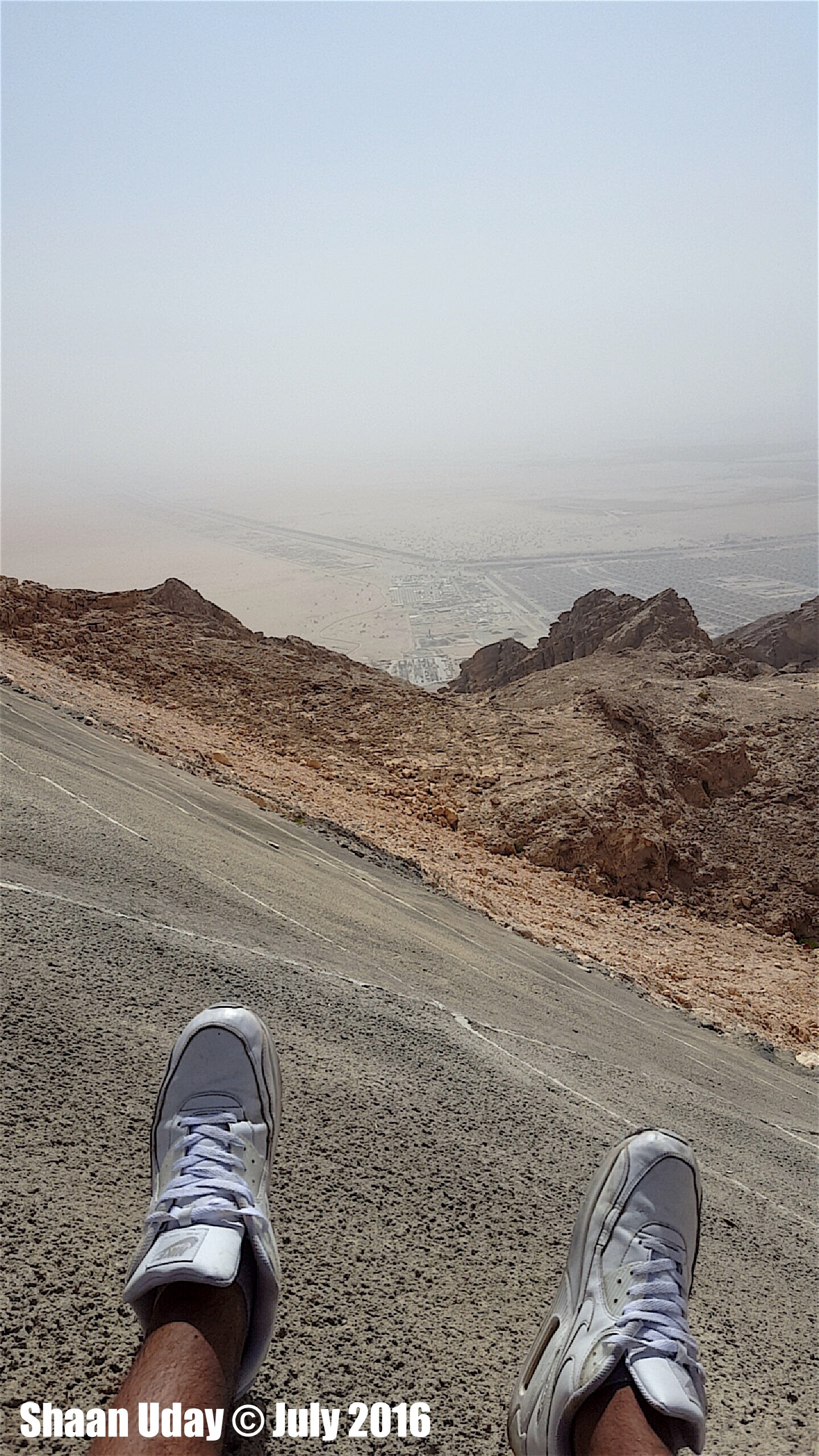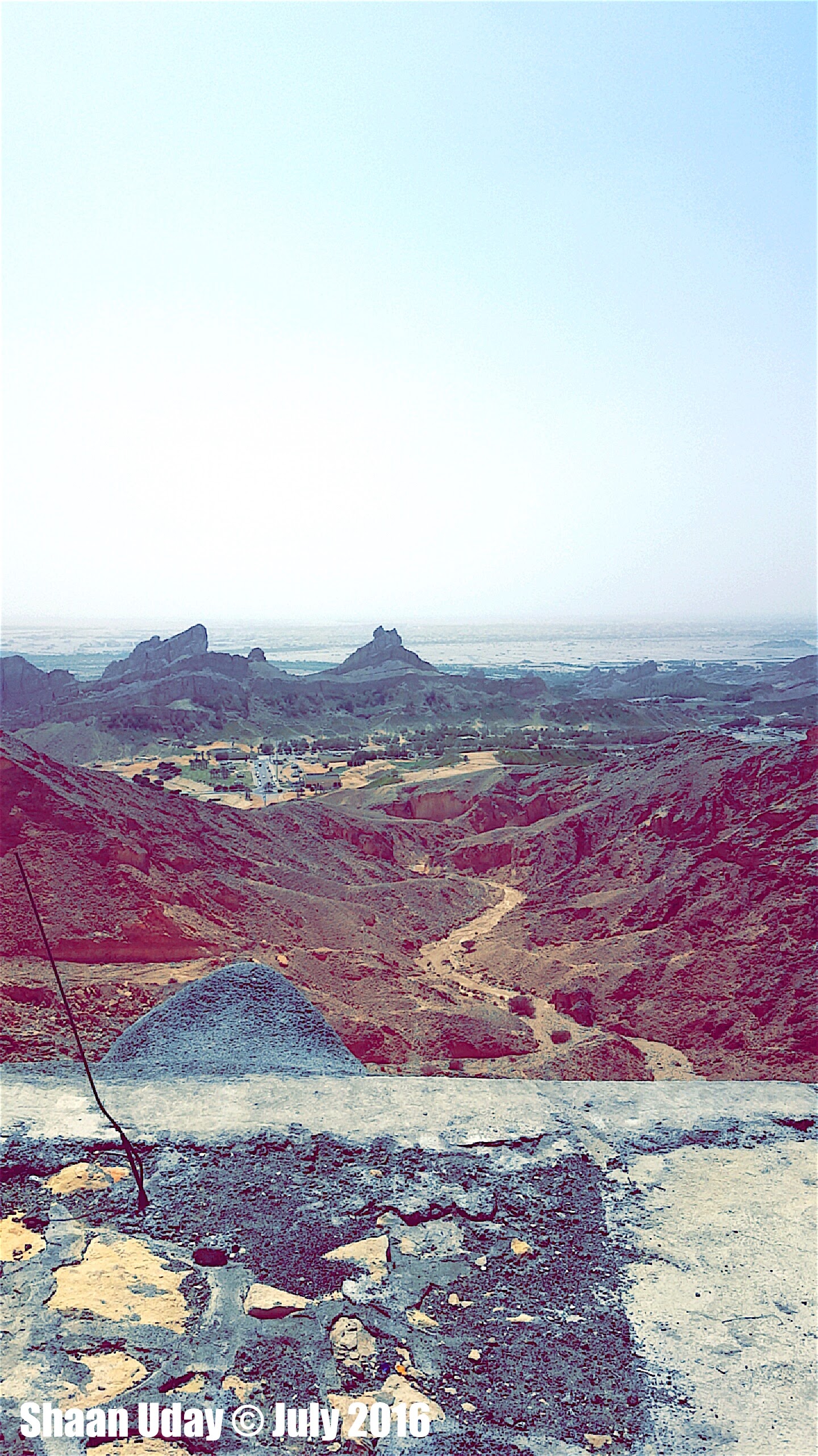 Jebel Hafeet [Map]] Jebel Hafeet is located in the outskirts of Al Ain, towards south, about 30km from the town. Its summit is the highest point in the UAE, 1249m/4098ft. It was the finest panoramic view from the top to the city of Al Ain in the North and to the far desert of Oman in the south. Its mountain crosses the border with Oman and extends few more miles into Oman. Another few miles towards the south would have made our trip reaching into the border of Oman. Maybe there were electrified fences, never know. Along the way up, there were many spots with parking facilities where we stopped and snapped. It was mid noon when we reached Jebel Hafeet mountains. It was not the ideal time to be in that openness especially during the hottest periods. To reach to the top, we exited the highway E7 and drove for 12km more on a well laid single curvy lane, along with many other modern automobiles. The heat at the top was 47 Celcius, and we were surrounded by nothing but dunes and limestones. There was a huge car park at the top. Even in that heat, all parking spaces were filled, and many Afghanistanis rounded up and laughing, chatting, and few were dancing folk dance. To avoid congestion, we left before others left. When we left, having experienced the beauty of the desert, saw many cars snaking their way up to the mountain, to have their go. It would have been more beautiful if that was during sunset. It was such a wonderful place to visit. Due to the rising heat, we had to leave within half an hour of arriving there. Otherwise, we would have stayed there indefinitely. Driving towards the mountain itself was an enjoyable and astounding experience. Never to be missed.